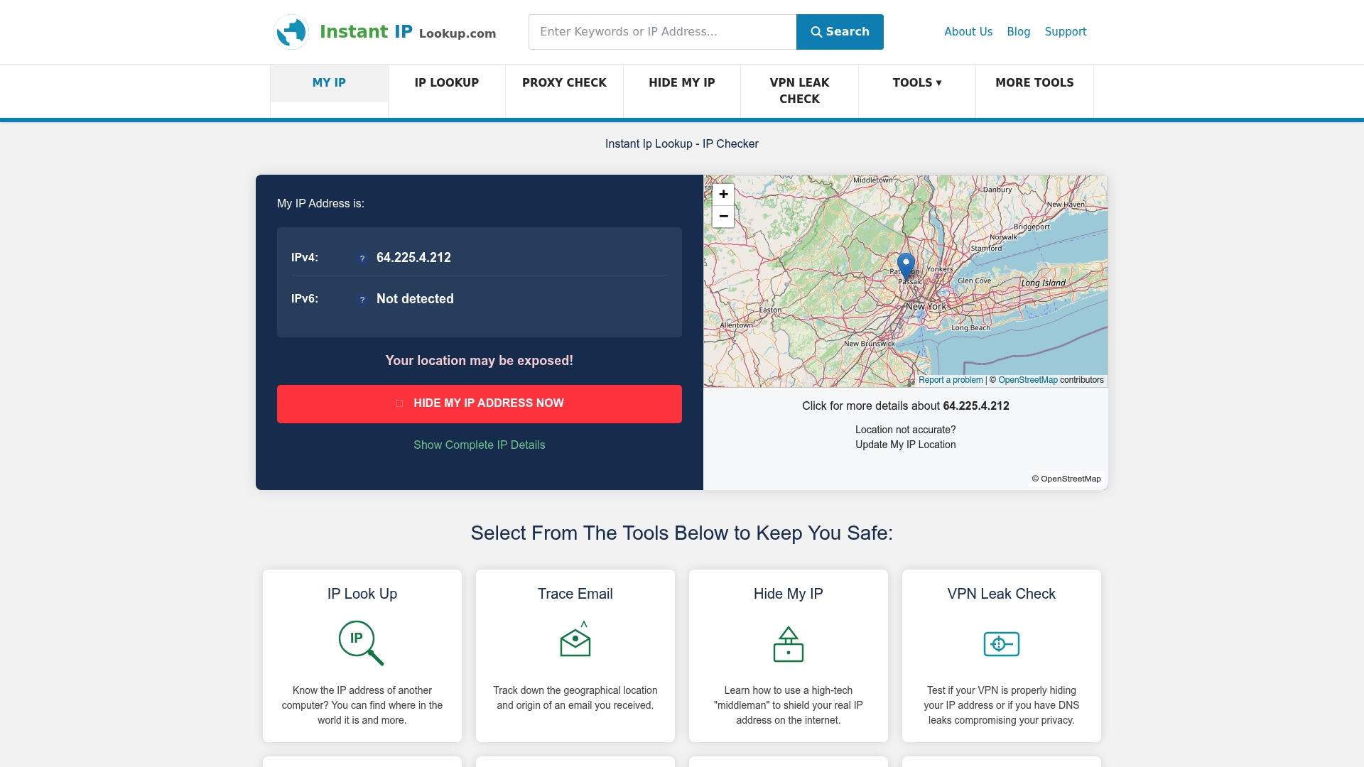 Comprehensive IP information: The site returns geolocation and provider details that help you confirm what your connection exposes to the internet.