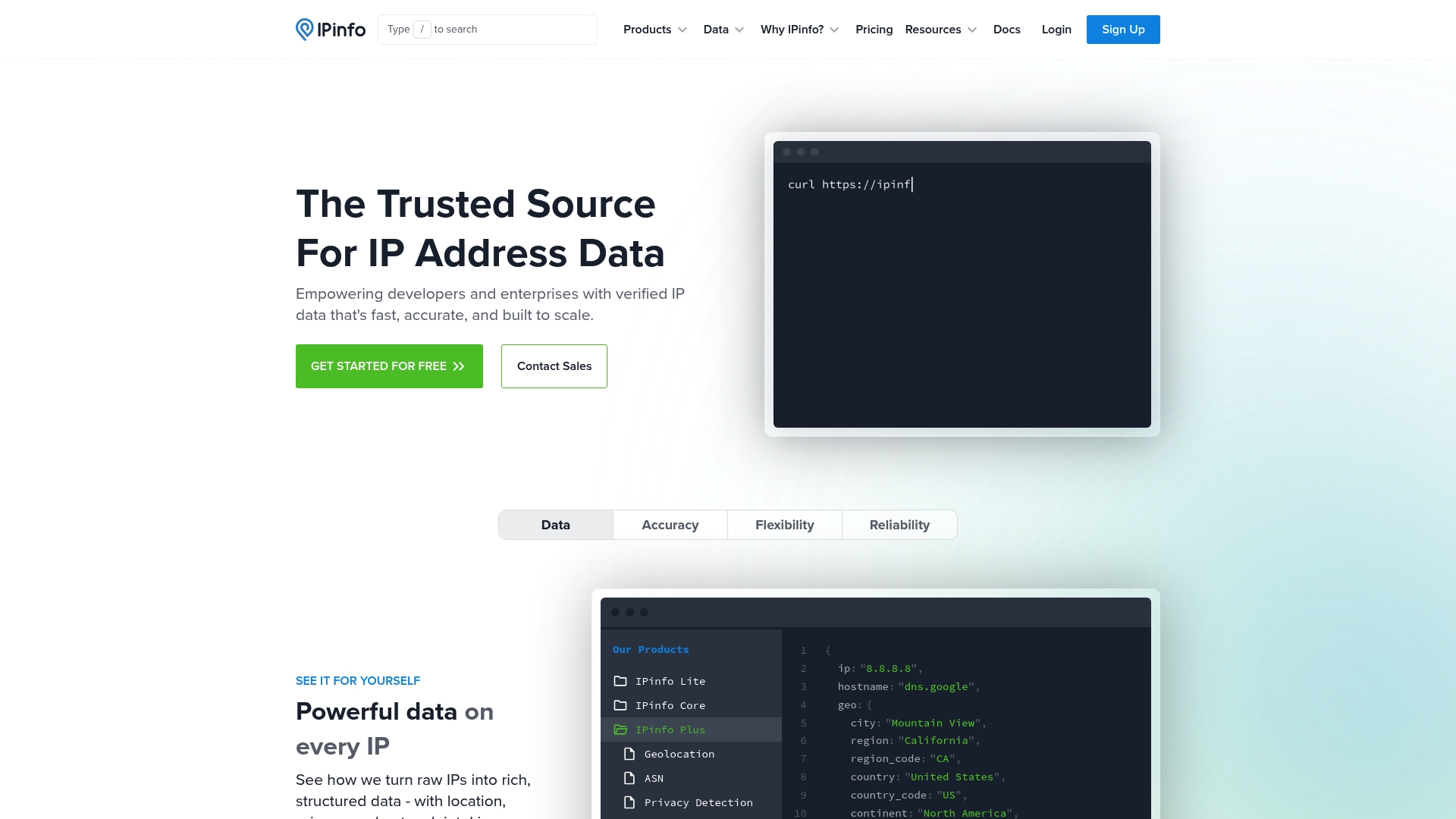 IPinfo supplies verified IP data with a focus on accuracy, scalability and enterprise use. The service suits teams that need dependable geolocation, ASN and privacy detection for integration into security or analytics workflows.