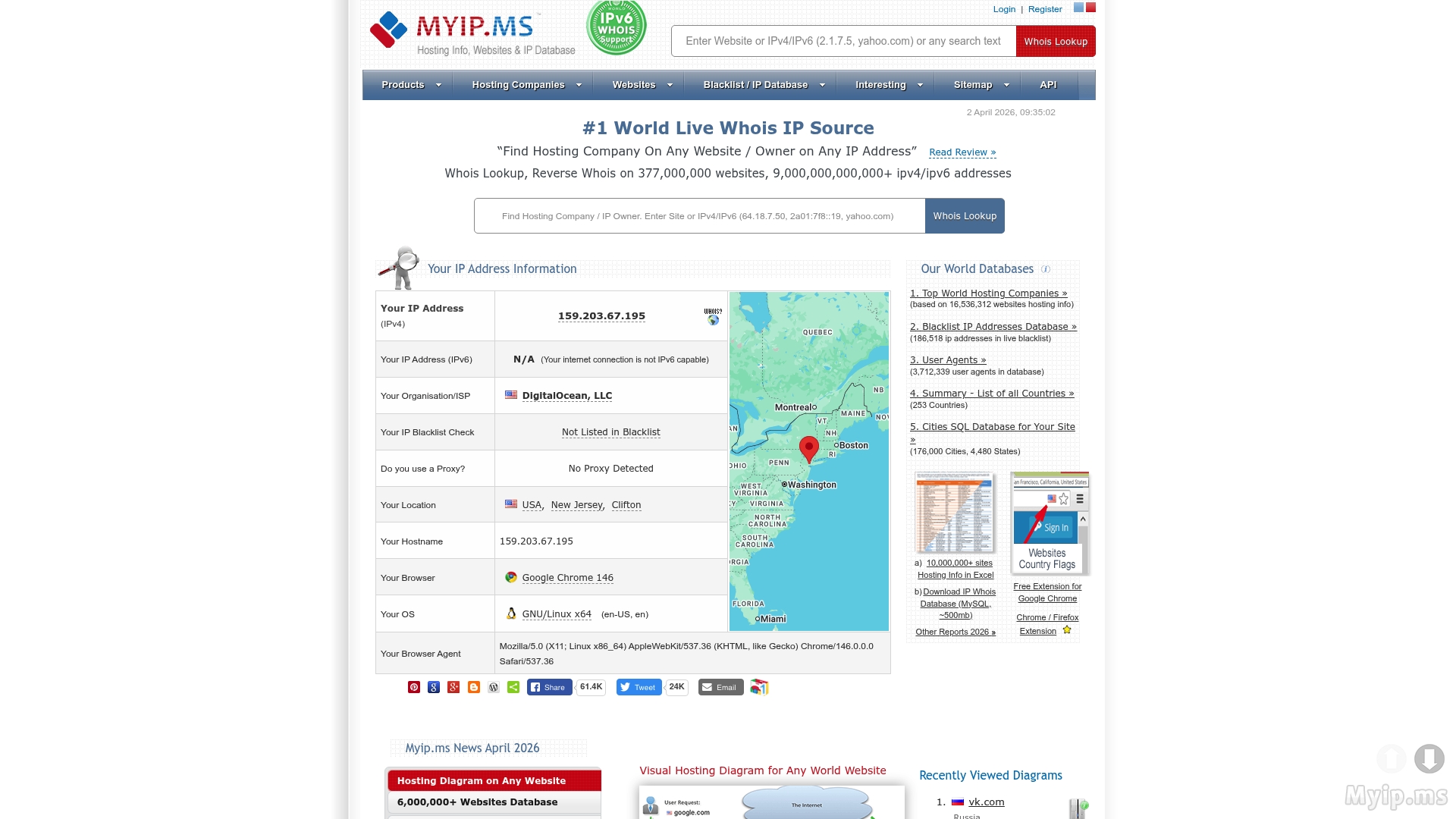Myip.ms combines IP Whois Lookup (IPv4 & IPv6) with a Live Blacklist Check and Database so you can assess reputation quickly. The platform also provides websites hosting information and statistics, owner and hosting company data, plus downloadable datasets for research and reporting.