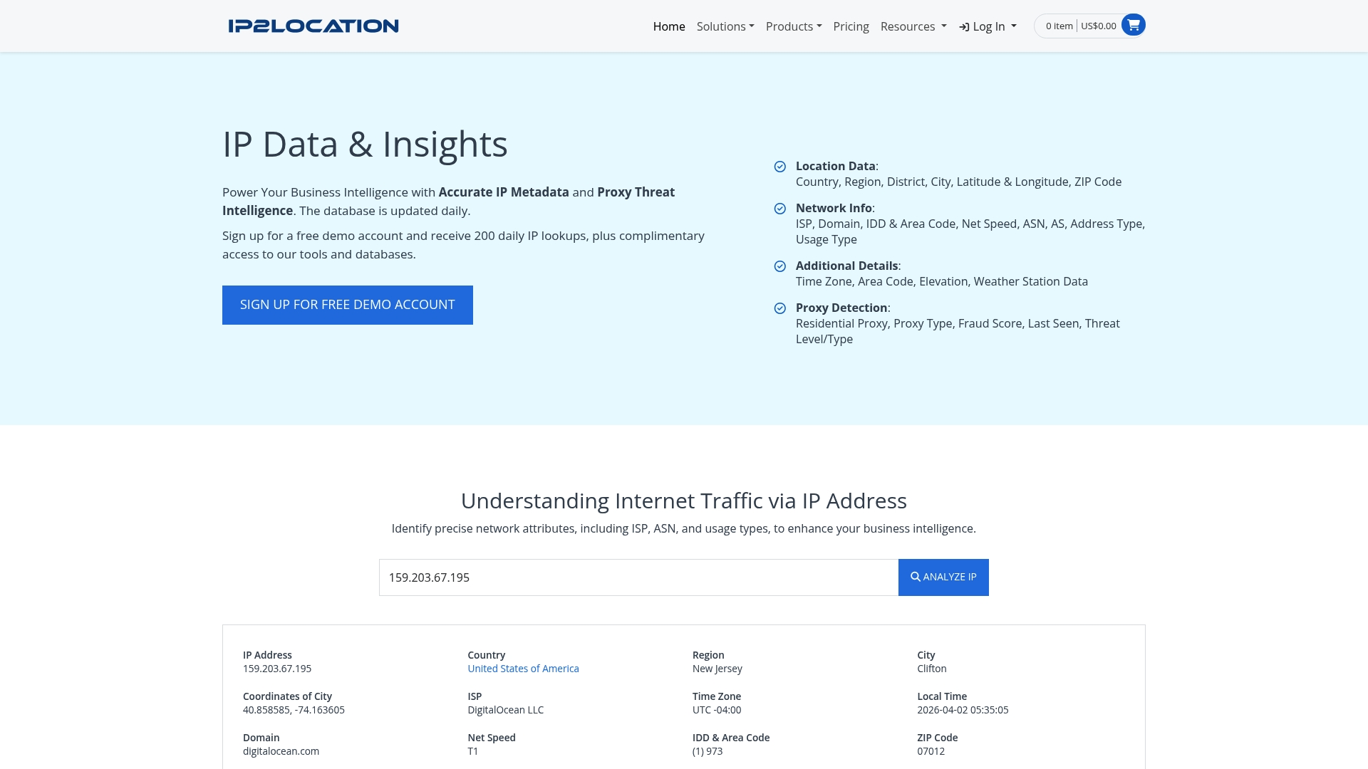 IP2Location offers geolocation data including country, region, city, latitude, longitude and ZIP code alongside network attributes such as ISP and ASN. The service provides proxy detection for residential proxies, VPNs and TOR and delivers real time IP insights via databases, REST API and SDKs.
