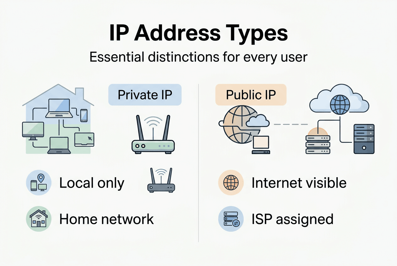 Every device connected to the internet receives two IP addresses: private and public. Think of your private IP as your apartment number within a building, while your public IP represents the building's street address that the outside world sees. Your router assigns private IPs to devices on your local network, creating an internal addressing system that keeps your home network organized.