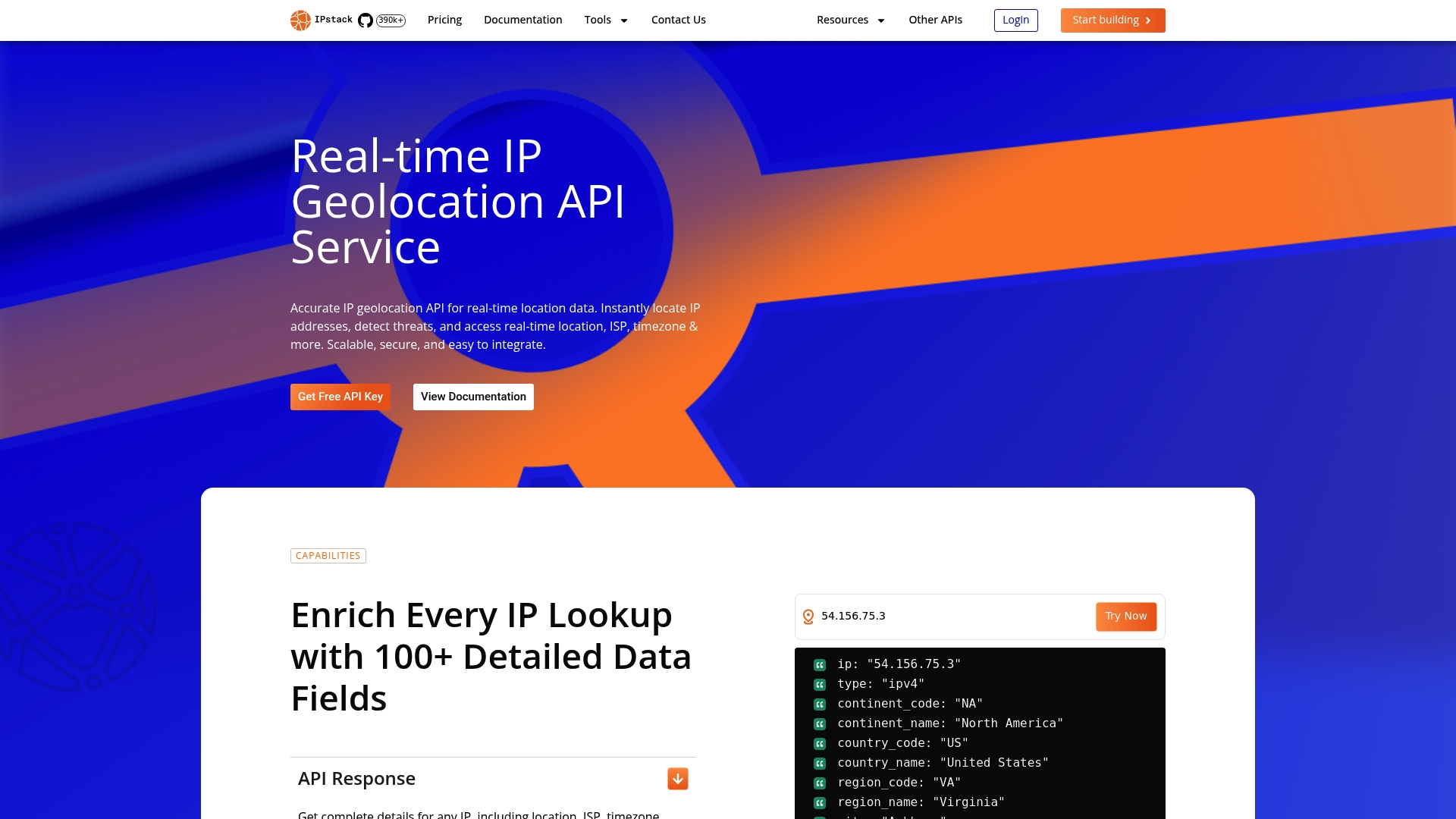 ipstack enriches lookups with 100+ detailed data fields including city, region, country, latitude, and longitude alongside ISP, ASN, and connection type. The API detects proxies, VPNs and threats, supports JSON and XML formats, and benefits from ISP partnerships plus frequent database updates.