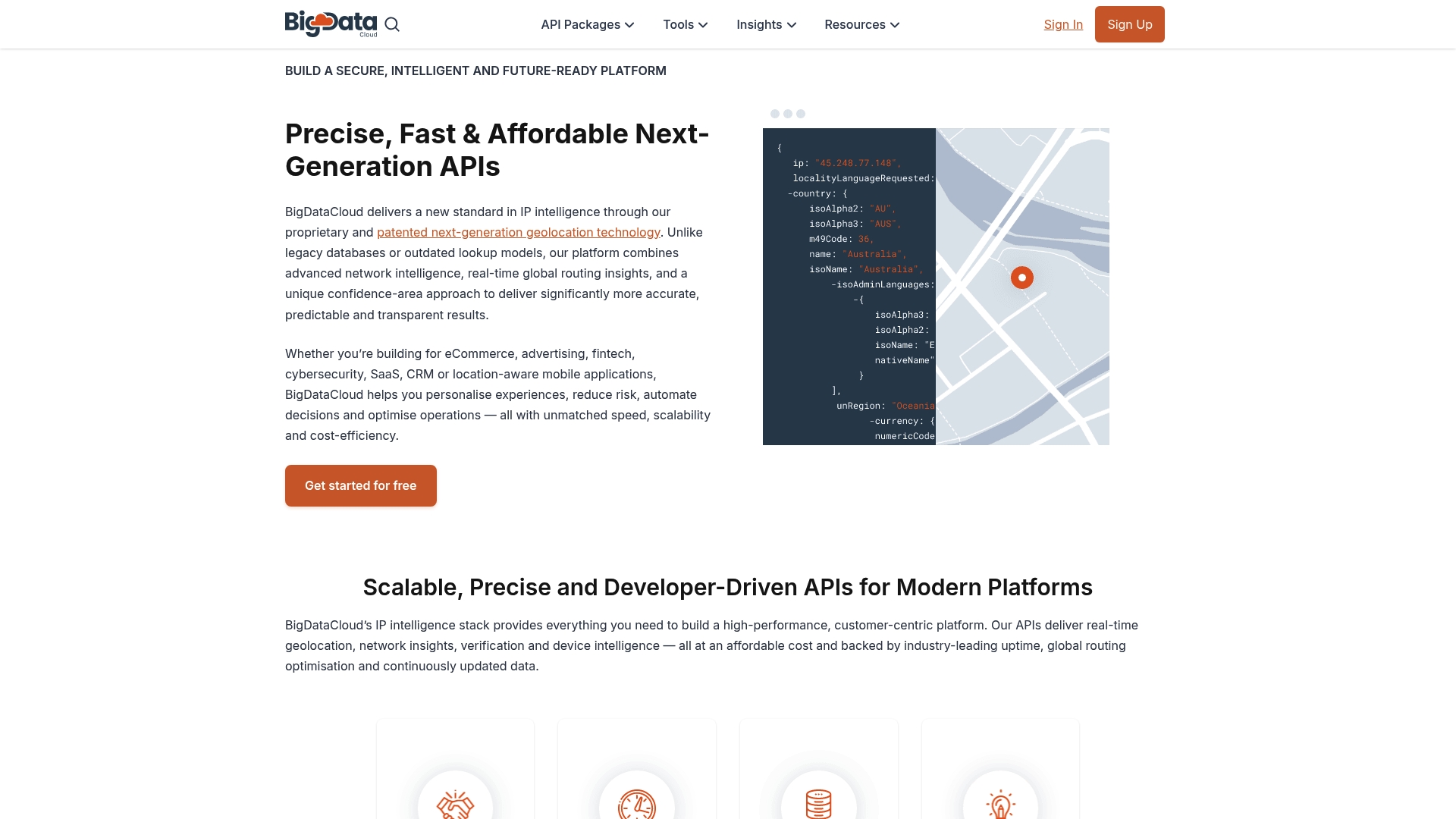 BigDataCloud centres on a proprietary, patented next-generation geolocation technology and a confidence-area approach for IP placement that improves predictability of results. The service includes IP Geolocation, Reverse Geocoding, Phone and Email Verification, Network Engineering APIs and GraphQL support.